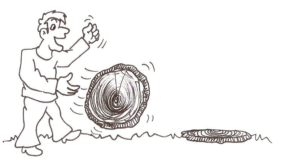Möglichst dünne Baumscheiben großen Durchmessers sollen ab einer festgelegten Startlinie möglichst weit gerollt werden.