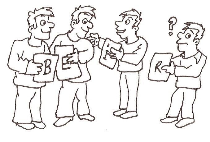 Die Mitspieler haben die Buchstaben auf ihrem Bauch und Rücken klebend, so dass sie ihren eigenen Buchstaben nicht lesen können und von den anderen Mitspielern richtig gestellt werden müssen.