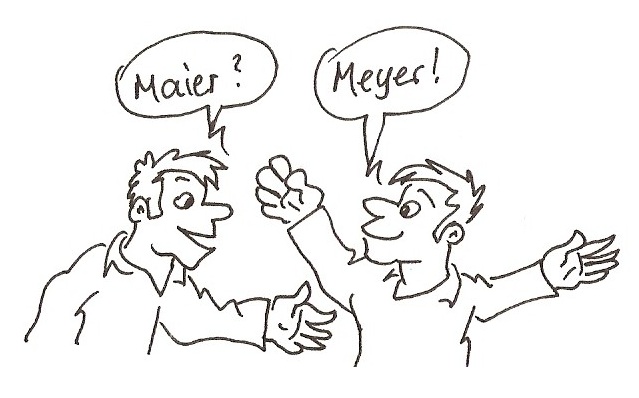 Der Trick des Spiels ist nämlich, dass auf jedem Zettel der scheinbar gleiche Name steht, nur in unterschiedlicher Schreibweise, also Mayer, Maier, Meier, Meyer.