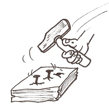 Mit einem Hammer (die spitze Seite!!) soll ein Nagel mit möglichst wenig Schlägen komplett im Brett versenkt werden.