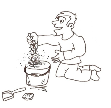 Nacheinander darf nun jeder Mitspieler sich eine Handvoll Sand nehmen und diesen aus den Fingern zurück in den Eimer rieseln lassen.
