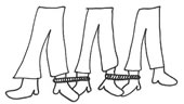 des zweiten von rechts. Dessen linkes Bein mit dem rechten des zweiten
