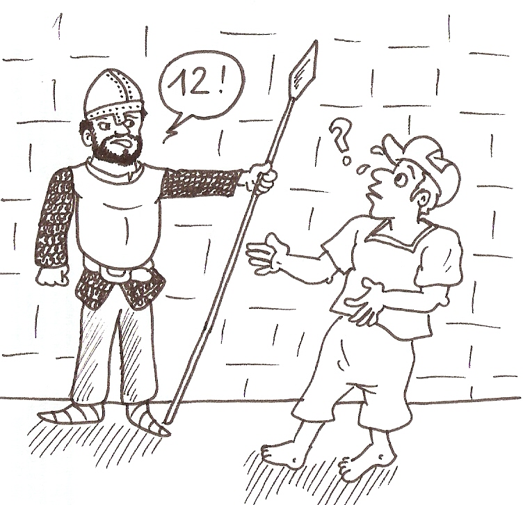Wächter verstellt ihm den Weg und sagt: "12". Der Spion erwiedert: